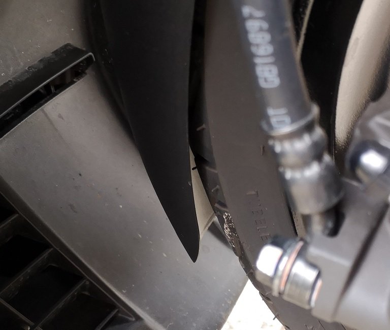 Bei der ersten und zweiten Montage, erkennbar an den drei Lochreihen, war der Abstand zum Reifen relativ gering und der Spritzschutz vibrierte relativ stark.