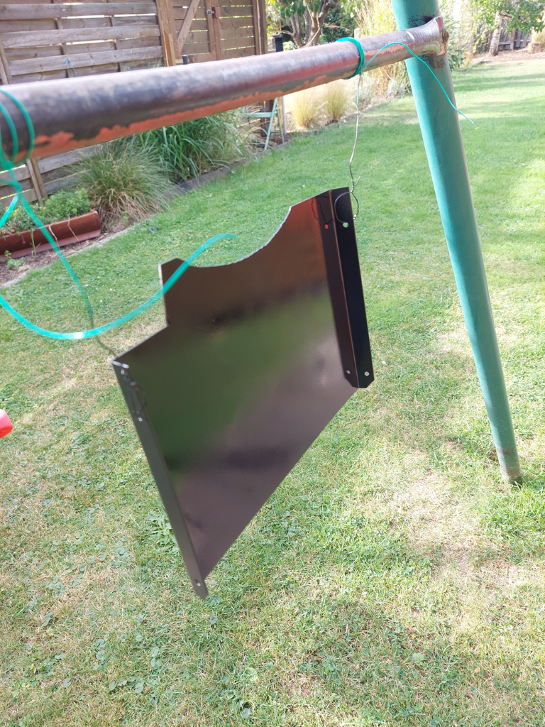 Am Freitag habe ich mir eine Pappschablone geschnitten, ein Blech danach angepasst, lackiert und das ganze im Helmfach verschraubt.