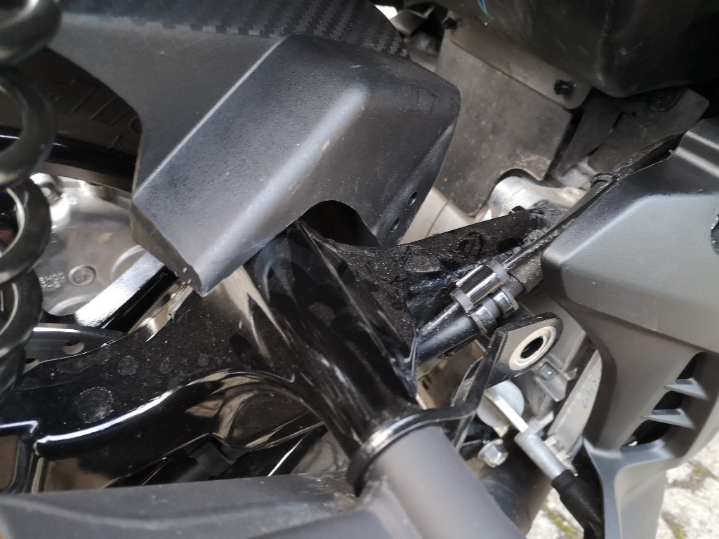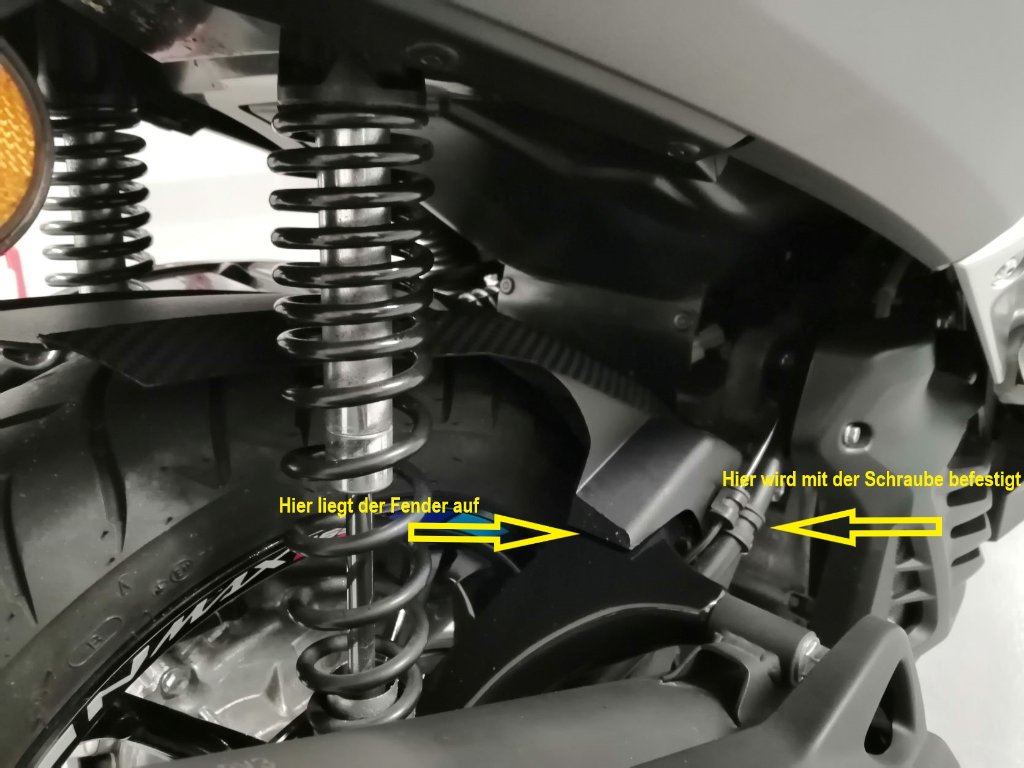 Auf der rechten Seite, also zum Auspuff hin, war das untere der beiden Löcher im Fender zu erweitern (beim 20er Modell war das ja wohl nicht nötig). Ich habe einen 9mm Bohrer genommen und den Rest gefräst. Die Kunststoffspäne sauber entfernt. Es war schon einige Kraftanstrengung erforderlich das Kunststoffteil zwischen Aufhängung plus Kabelführung zu klemmen und dann auch noch die Schraube durchschieben zu können, damit sie auch im Gewinde fasst. Es war sehr stramm.