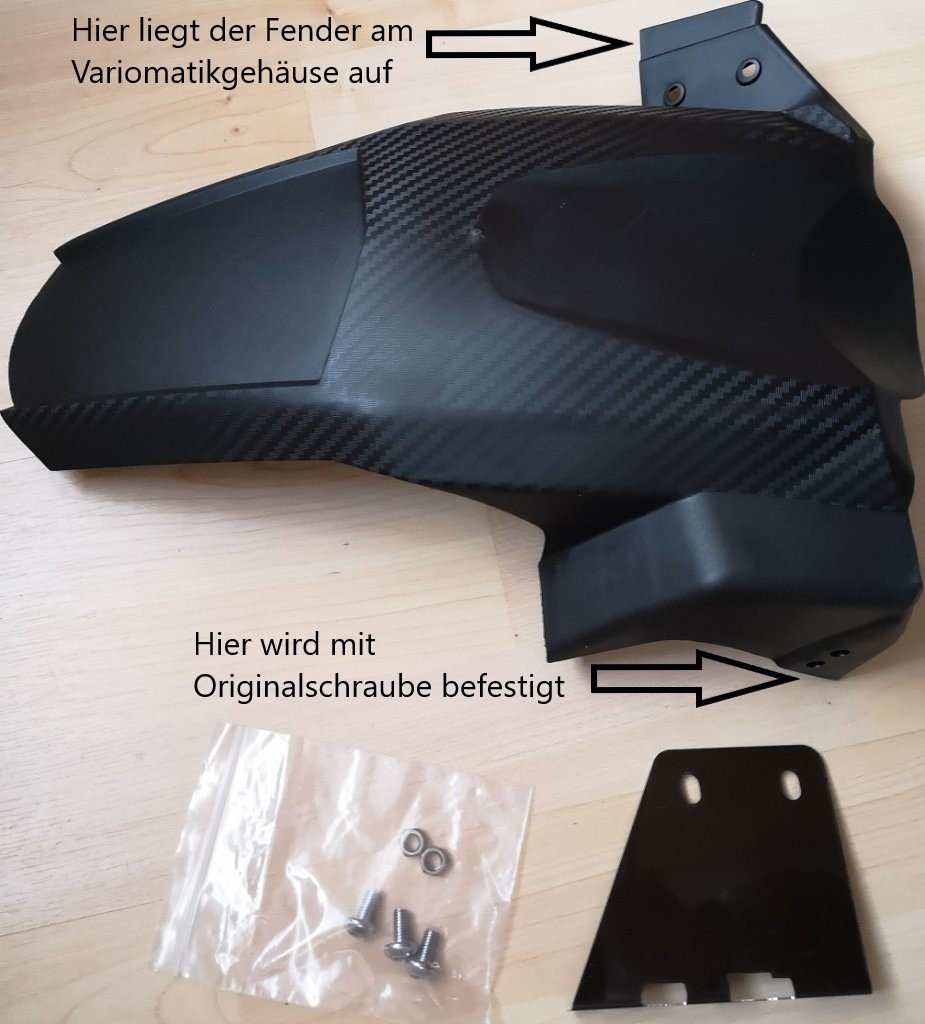 ). In der Tat ist das Blech eine gute Idee und passt auch. Es wird am Variomatikgehäuse mit 2 Schrauben verschraubt, zum einen eine der Schrauben der Luftfilterbefestigung zum anderen eine reine Variomatikdeckelschraube. Um die Variomatikgehäuse lösen zu können, braucht man entweder einen rechtwinkligen Schrauber mit Nuss oder baut die Variomatikgehäuseverkleidung ab. Ich hab mich für Letzteres entschieden.