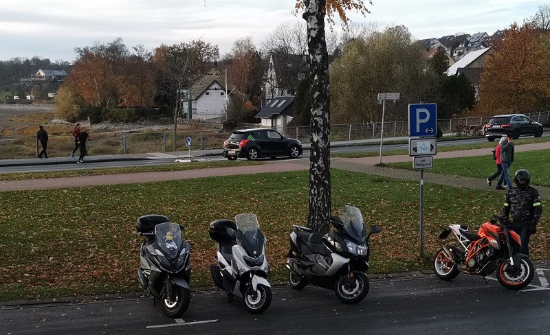Alles wiede auf Null, heute haben wir, eine 125 Kymko, eine BMW C650 GT und meine N Max eine kleine Tour zur Möhnesee gemacht, mit Pause im "Geronimo". Vorher habe ich den Reifendruck vorne auf 2 bar und hinten 2,2 bar eingestellt, habe die Asphalttemperatur gemessen (Sonne 9,2°, Schatten 5°) und die Reifen kalt vor der Abfahrt in der Garage. Vorne 3,1° Hinten 5,0°, nicht viel. Gute Reifen sollen schon nach kurzer Zeit in einem Bereich kommen, in dem (20–25 °C) mit ausreichend Haftung gerechnet werden kann, nun war ich gespannt. :roll: