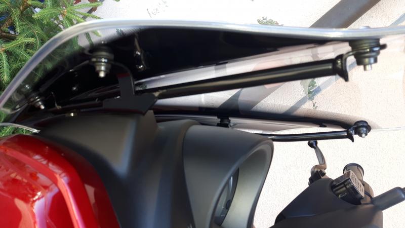 Eine Montageanleitung habe ich jetzt nicht, aber hier mal dann 2 Fotos. Du brauchst eine Halterung (Ich nehme mal an, die gehört bei den 170 € für das Windschild dazu), die wird an den Löchern verschraubt, wo das kleine Schild befestigt wird. Daran wird dann die große Scheibe angeschraubt.