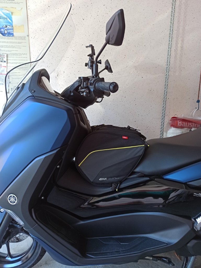 Material ist durchaus robust, wasserdicht ist aber natürlich was anderes. Aber da denke ich sind die beiden Taschen (Yamaha und Givi) weitgehend gleich. Leichter Nieselregen wird, auch wegen der eh schon recht geschützten Position am Roller, nicht viel ausmachen. Dauerregen auf Tour, da werden in erster Linie irgendwann die Reißverschlüsse Wasser einlassen, die liegen, speziell von den beiden Seitentaschen, offen.