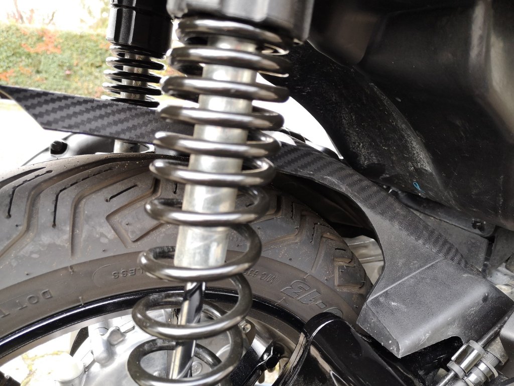 Auf der rechten Seite, also zum Auspuff hin, war das untere der beiden Löcher im Fender zu erweitern (beim 20er Modell war das ja wohl nicht nötig). Ich habe einen 9mm Bohrer genommen und den Rest gefräst. Die Kunststoffspäne sauber entfernt. Es war schon einige Kraftanstrengung erforderlich das Kunststoffteil zwischen Aufhängung plus Kabelführung zu klemmen und dann auch noch die Schraube durchschieben zu können, damit sie auch im Gewinde fasst. Es war sehr stramm.