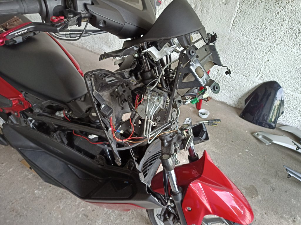 Dann dachte ich, ich kann den Lenker nach oben abziehen: Am Arsch, die Bremsleitumgem und Kabel und Gaszüge sind zu kurz. Also die Lenkerverkleidung abbauen, Bremshebel und Gaszüge ab.