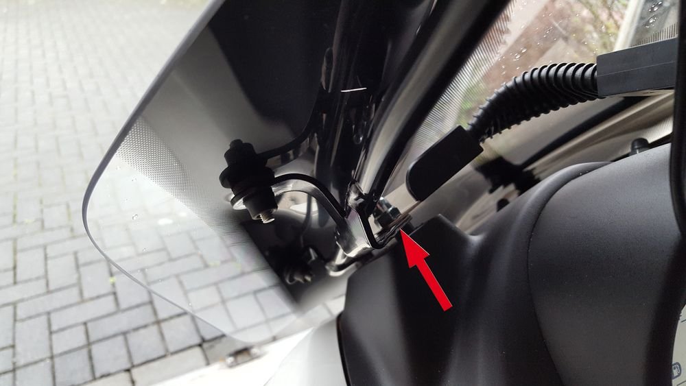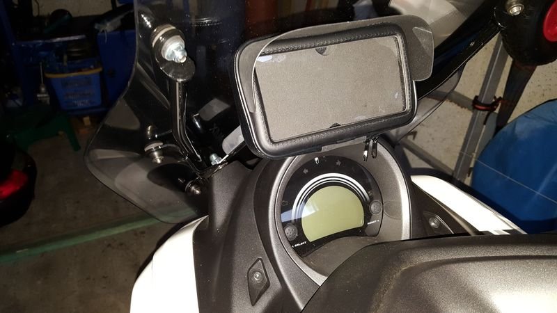 ich wollte mir eigentlich keine Handyhalterung anbauen und das Handy nur in das linke Flaschenfach legen, hatte ich ja schon einmal gemacht, funktionierte prima. Jetzt habe ich mir doch eine Halterung zugelegt, da ich einen Platz gefunden habe, wo es im Blickfeld liegt, wie der Tacho. Befestigt an der mittleren Windschild/ Rahmen Verbindung.