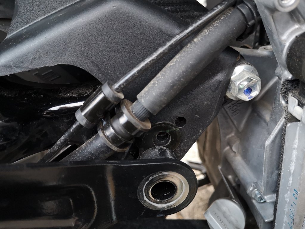 Auf der rechten Seite, also zum Auspuff hin, war das untere der beiden Löcher im Fender zu erweitern (beim 20er Modell war das ja wohl nicht nötig). Ich habe einen 9mm Bohrer genommen und den Rest gefräst. Die Kunststoffspäne sauber entfernt. Es war schon einige Kraftanstrengung erforderlich das Kunststoffteil zwischen Aufhängung plus Kabelführung zu klemmen und dann auch noch die Schraube durchschieben zu können, damit sie auch im Gewinde fasst. Es war sehr stramm.