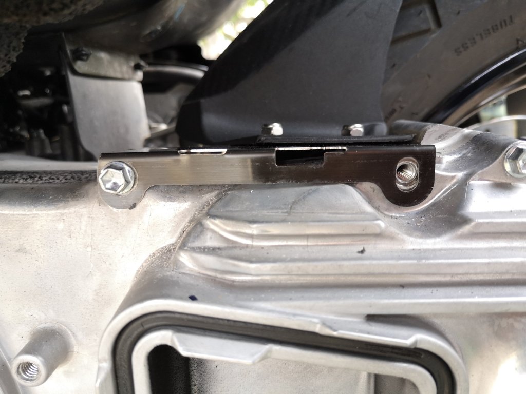 Ihr merkt, ich wollte mich mit dem Einklemmen nicht zufrieden geben (ich hör´s schon, die Deutschen und ihre Pingeligkeit ;) ). In der Tat ist das Blech eine gute Idee und passt auch. Es wird am Variomatikgehäuse mit 2 Schrauben verschraubt, zum einen eine der Schrauben der Luftfilterbefestigung zum anderen eine reine Variomatikdeckelschraube. Um die Variomatikgehäuse lösen zu können, braucht man entweder einen rechtwinkligen Schrauber mit Nuss oder baut die Variomatikgehäuseverkleidung ab. Ich hab mich für Letzteres entschieden.