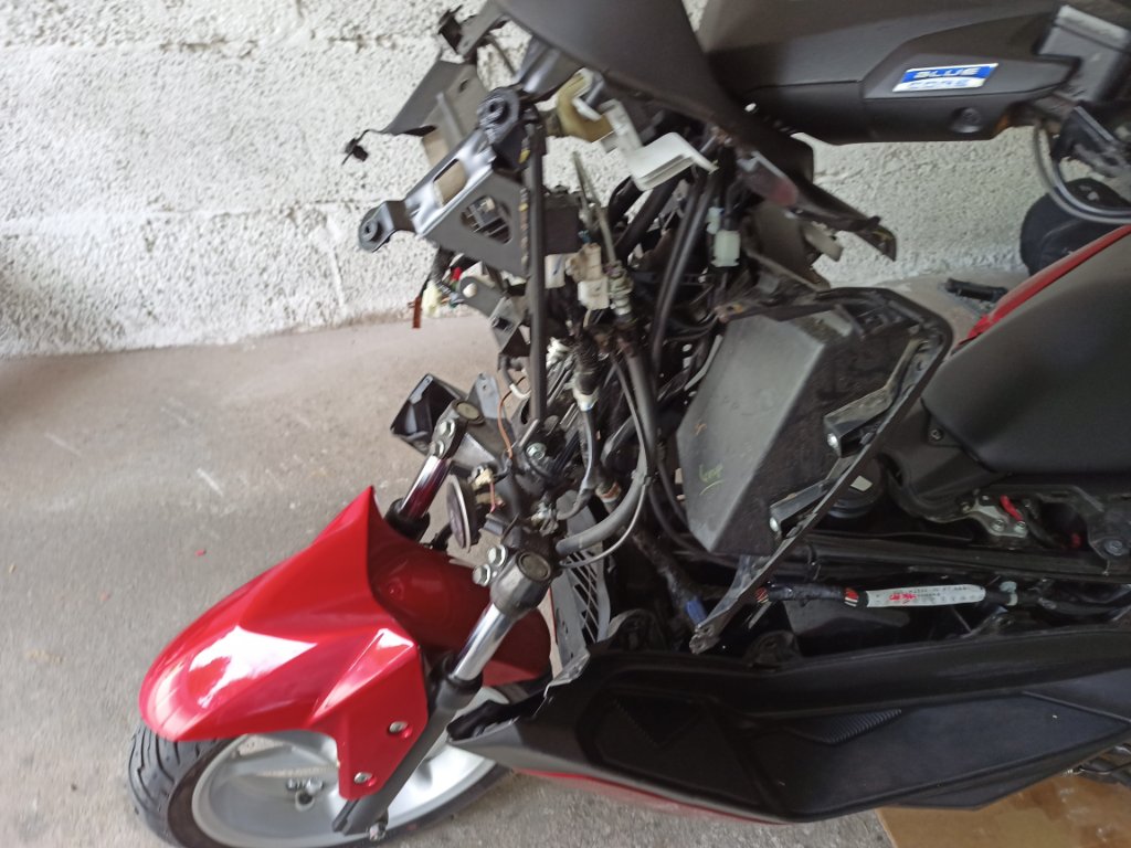 Dann dachte ich, ich kann den Lenker nach oben abziehen: Am Arsch, die Bremsleitumgem und Kabel und Gaszüge sind zu kurz. Also die Lenkerverkleidung abbauen, Bremshebel und Gaszüge ab.